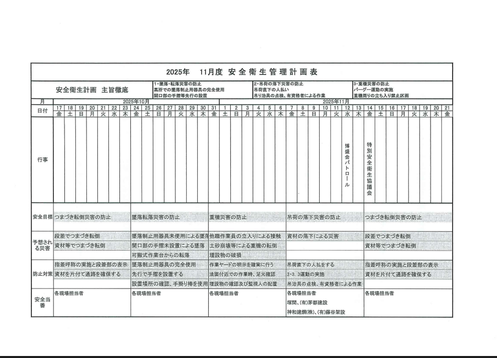 安全衛生管理計画の発表、博盛会パトロール報告、安全指示及び要請、