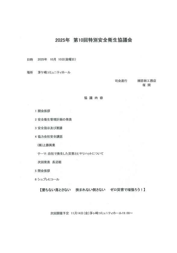 茅ケ崎コミュニティーホールにて、令和7年 第10回特別安全衛生協議会を行いました。